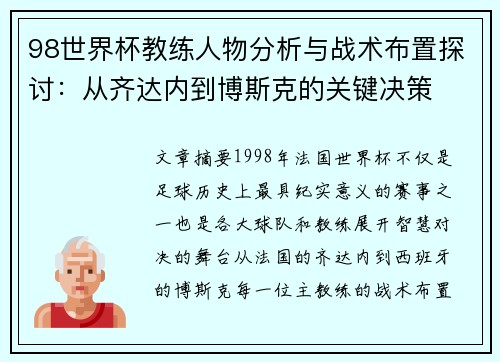 1998年世界杯是意大利足球历史上一个充满期待与遗憾的赛季。尽管这支球队具备了不少明星球员,且拥有强大的阵容深度,但最终未能如愿捧起大力神杯,最终止步于半决赛。本文将从四个方面详细回顾1998年意大利世界杯的阵容,并结合战术布局及球员表现进行深度分析。首先,我们将回顾意大利队的核心阵容以及球队战术体...